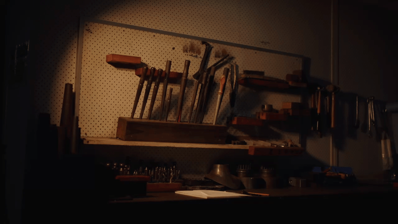 An elderly man with glasses and a blue sweater sitting in an art studio, surrounded by colorful landscape paintings and art supplies.